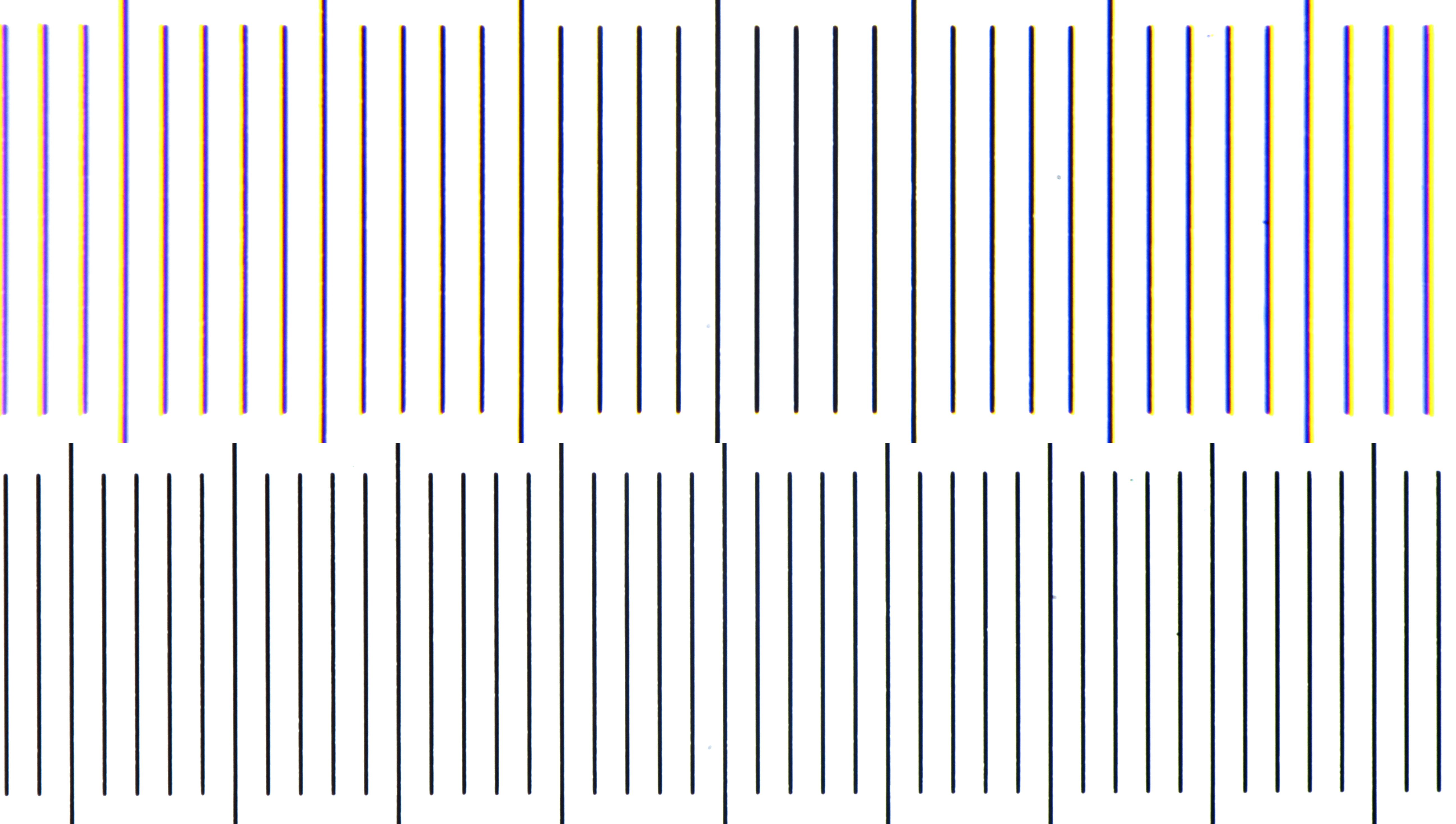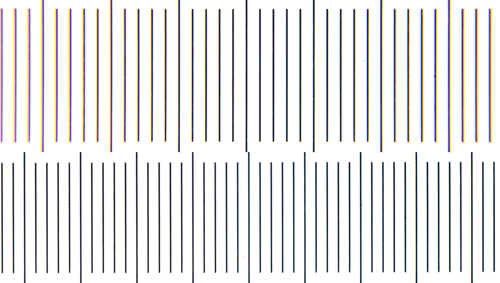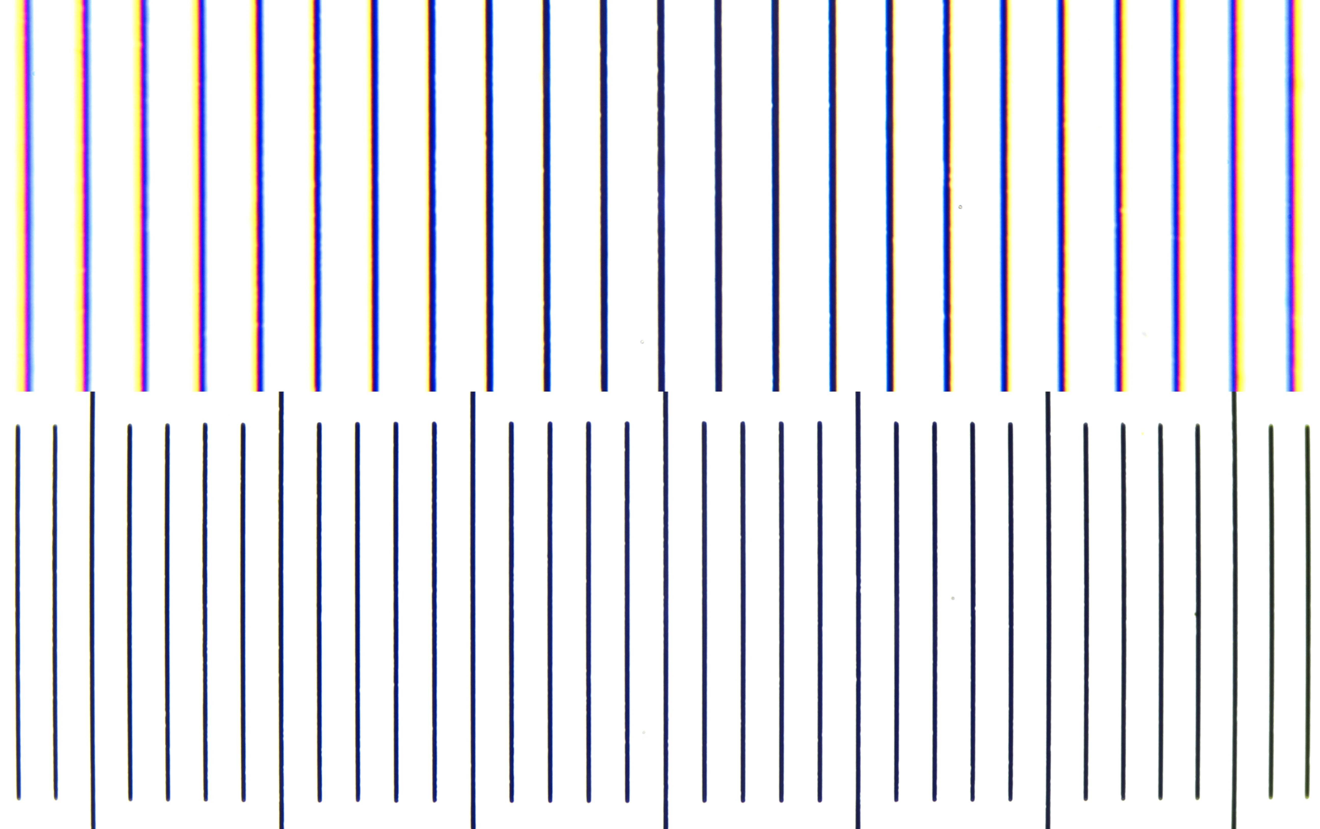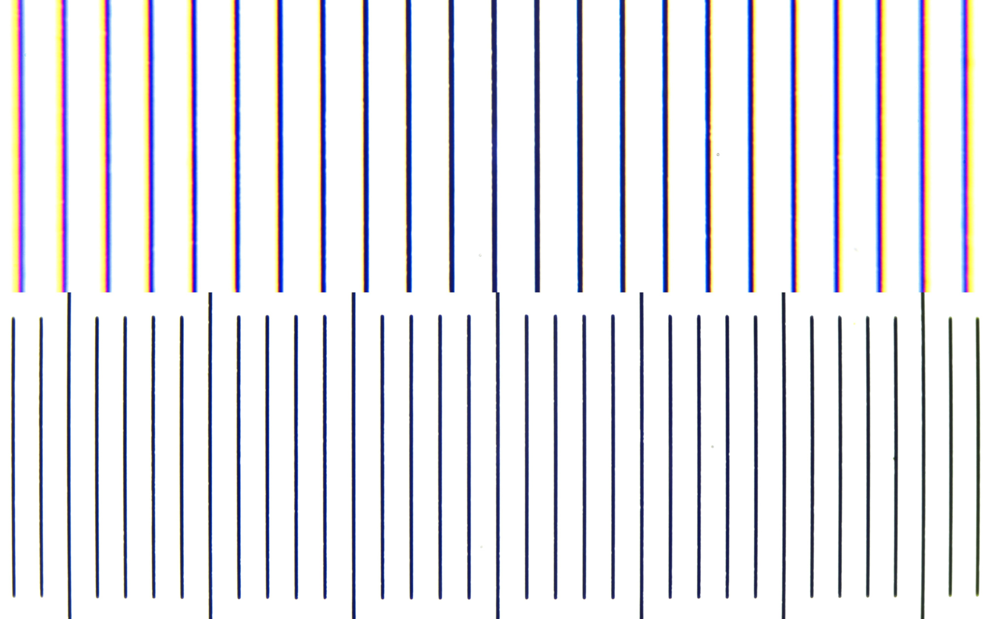 Objektmikrometer, fotografiert mit Carl Zeiss Plan 25/0.45 und einem universellen DSLR Adapter. Oben: ohne Feldlinse. Unten: mit der Feldlinse eines Leitz Periplan NF10x Okulars. Das obere Foto zeigt deutlich chromatische Aberrationen an den Rändern. Der fotografierte Bildausschnitt ist mit der Feldlinse deutlich größer. Es tritt eine leichte tonnenförmige Verzeichnung auf, die bei normalen Präparaten aber nicht sichtbar sein wird.