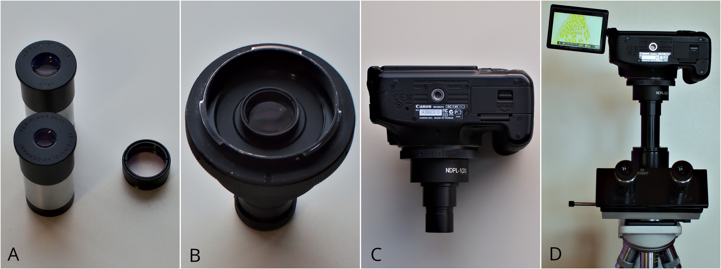 Modifikation des DSLR-Adapters für Leitz-Optik. A: Leitz Periplan GF10x/18 und Leitz Periplan 6.3x/18 mit daneben eine Feldlinse. Die Feldlinse beider Okulare kann verwendet werden. B: DSLR-Adapter mit Feldlinse und T2-Ring für Canon. C: Canon 600D Kamera mit montiertem DSLR-Adapter. D: Die Canon-Kamera wird an einem Leitz Laborlux-12 Mikroskop angebracht.