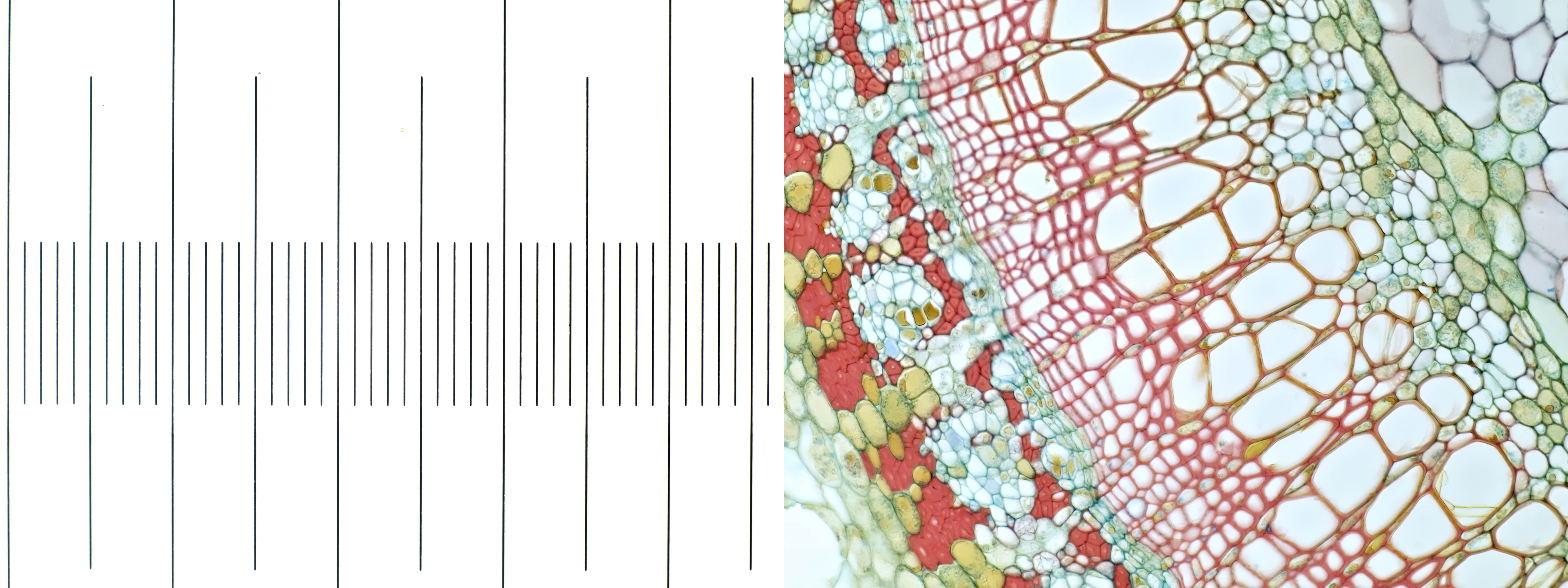 Objektmikrometer und ein Präparat vonTilia (Stiel), fotografiert mit Leitz NPL Fluotar 25/0.55 und einer Olympus PEN E-PL1 Kamera. Hierfür wurde die Feldlinse eines Leitz Periplan 6.3x/18 verwendet.