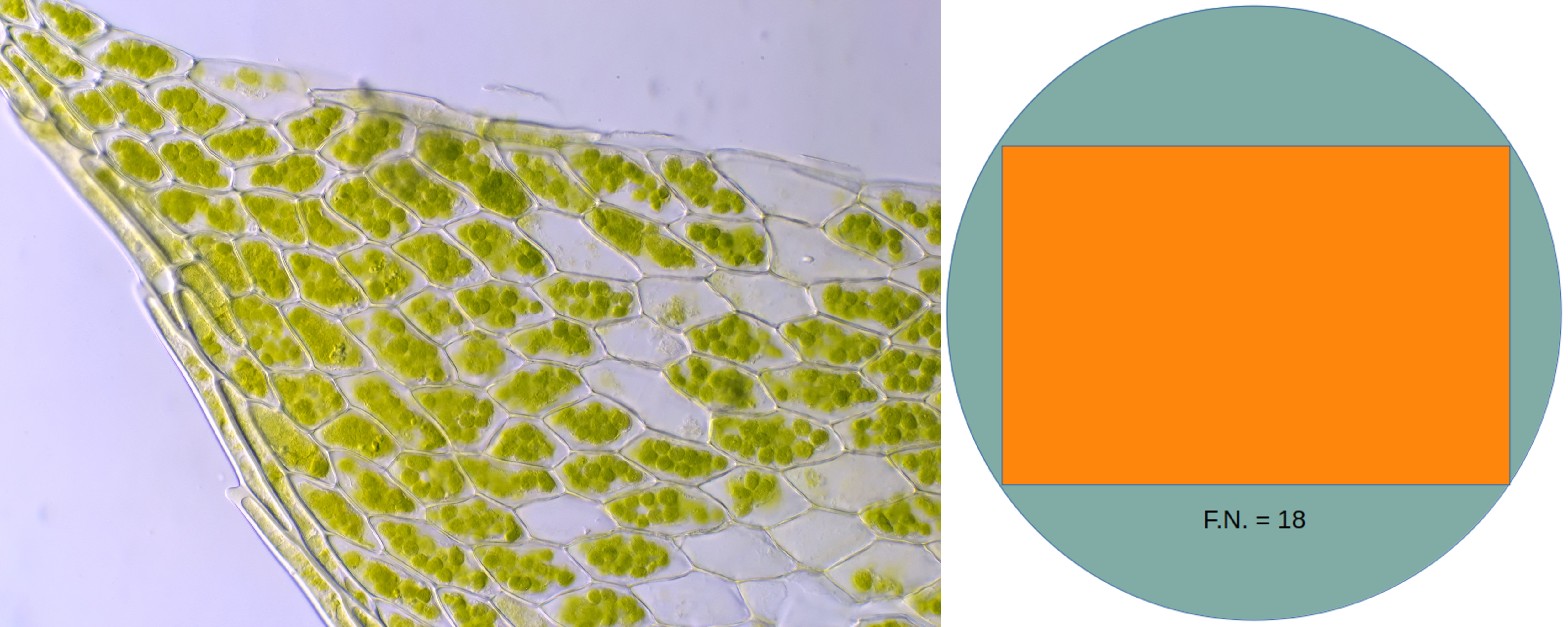 Ein Moos, fotografiert mit einem Leitz NPL Fluotar 40/0.70 und dem DSLR-Adapter (links). Hier wurde die Feldlinse eines Leitz Periplan 6.3x/18 verwendet. Rechts: Sehfeld eines Leitz Periplan GF10x Okulars mit Sehfeldzahl 18, wobei der mit einer Canon 600D fotografierte Bereich orange markiert ist.