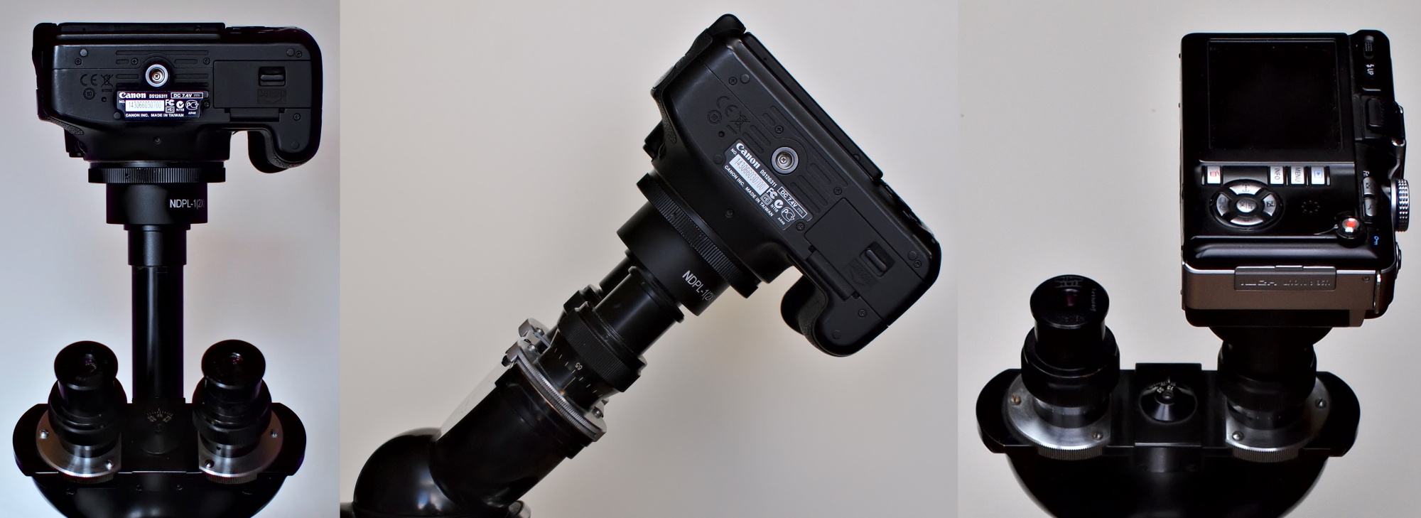 Rechts und Mitte: Eine Canon 600D Kamera, montiert auf einem Zeiss Standard GFL mit Trinokular- und Binokulartubus. Links: Eine Olympus PEN E-PL1 auf dem Binokulartubus des Zeiss Standard GFL.