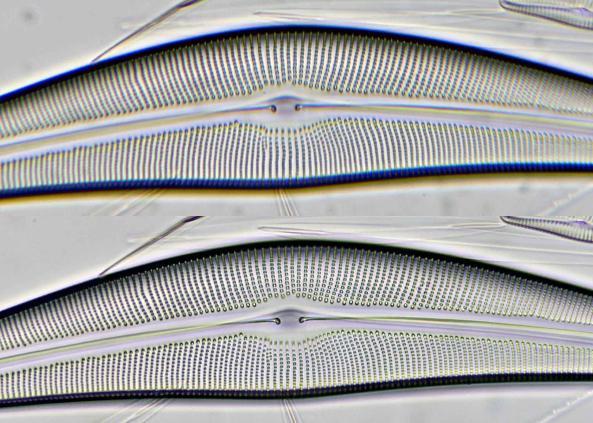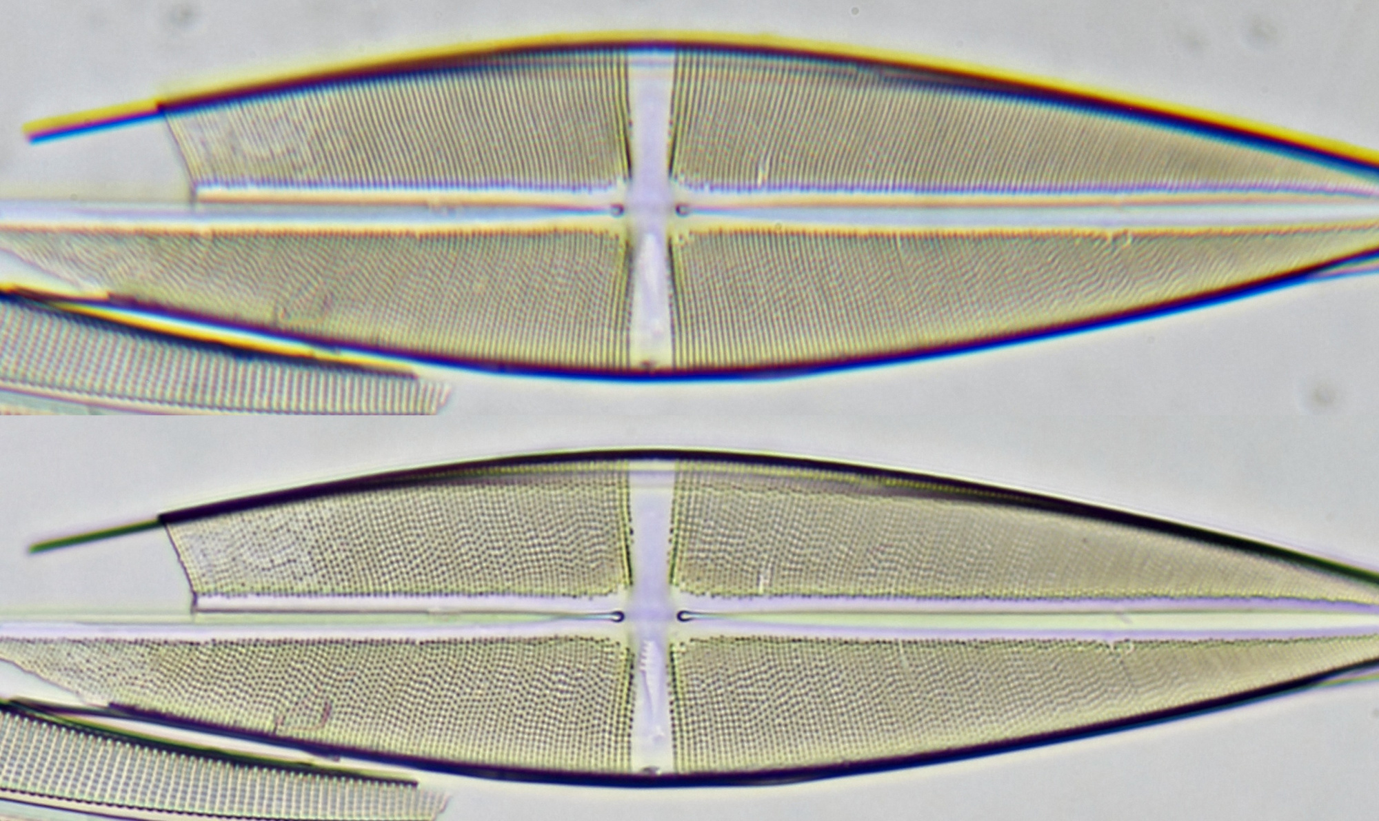 Ein Exemplar von Stauroneis, das sich außerhalb der Bildmitte befand, fotografiert mit Olympus 40/0.65. Oben: DSLR-Adapter ohne Feldlinse. Unten: DSLR-Adapter mit der Feldlinse eines Beck Kassel CBS 5x Okulars. Deutliche Korrektur der chromatischen Aberration im unteren Bild. Kamera: Canon 600D.