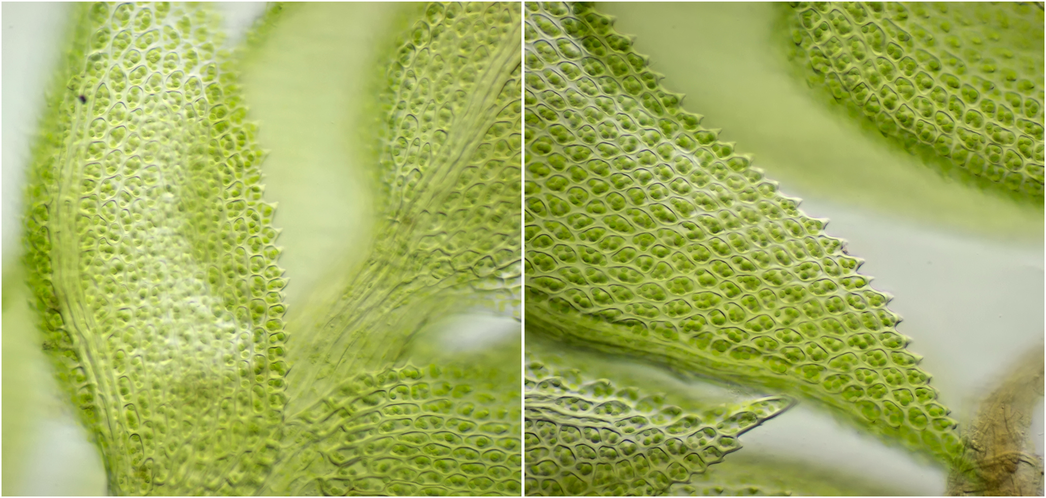 Detail van de bladrand van Dicranum uit Daun gefotografeerd met Olympus 40/0.65 in helderveld-belichting (boven) en schuine belichting (onder).
