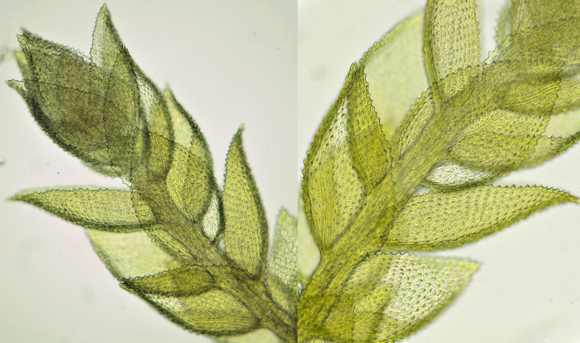 Mosblaadjes van een mos uit dezelfde achtertuin als hierboven en eveneens groeiende op een stoeptegel. Helderveld-opnames met Zeiss-Winkel 10/0.25 (links) en Zeiss-Winkel 40/0.65 (rechts).