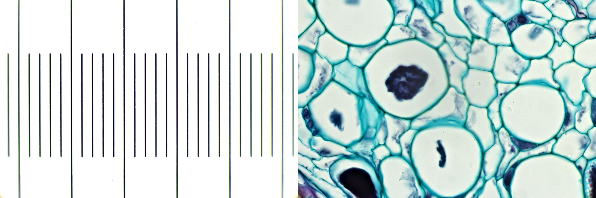 Objektmikrometer und Präparat von Tilia fotografiert mit Olympus Plan 20/0.40 (37 mm Abgleichlänge) und einem um 10 mm verlängerten P7x-Okular. Kamera: Canon 600D. Bildbreite: 740 μm.